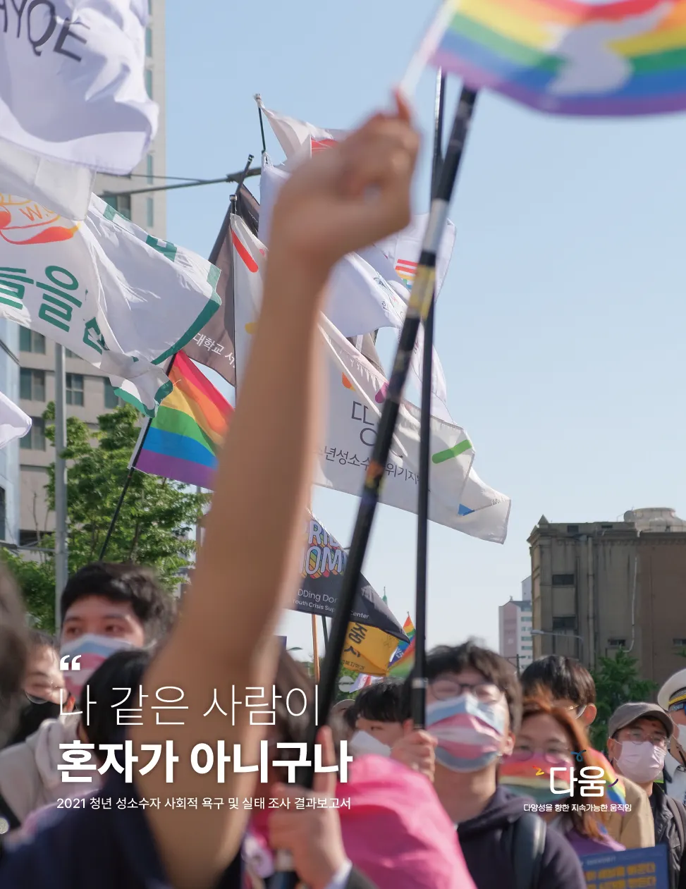 작년 8월 다움은 3,911명의 청년 성소수자 분들이 참여해주신 <2021 청년 성소수자 사회적 욕구 및 실태 조사>을 실시하였습니다. 오늘 5월 17일 국제성소수자혐오반대의날에 맞춰 이 조사의 결과보고서를 발간하게 되어 기쁩니다.