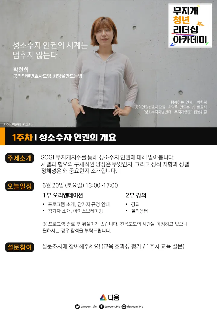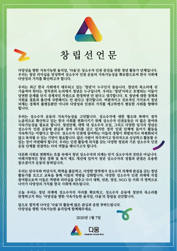 다양성을 향한 지속가능한 움직임, 다움은 한국 사회 내 다양성 확산과 성소수자 인권 개선에 활용하기 위한 목적으로 <2021 청년 성소수자 사회적 욕구 및 실태 조사>를 수행하여 보고서를 발간하였습니다. 본 조사의 원자료(raw data)를 활용하여 추가적인 분석과 연구를 수행하고자 하는 분들께서는 아래 양식을 작성해주시기 바랍니다. 더불어 자료의 전반적인 개요는 아래 첨부한 보고서와 문항지를 참고해주세요.