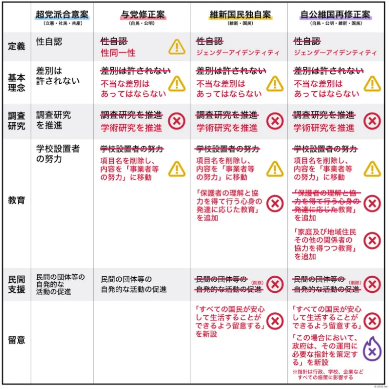 오래 전부터 일본 국회 안에서 여러 번 논의되던 차별금지법에 관해서 자민당을 제외한 정당들 사이에서는 공감대가 있었습니다. 일본 입법 과정의 전형적인 마무리는 (보수 여당인) 자민당에 의한 후퇴적(‘watered-down’) 입법입니다. 이번에도 주요 쟁점에서 급격히 후퇴한 수정이 여러 번 이루어졌습니다. 2023년 6월 16일 참의원 본회의에서 통과된 "성적 지향 및 젠더 아이덴티티의 다양성에 관한 국민의 이해 증진에 관한 법률안"은 “부당한 차별은 없어야 한다”고 하며 국가가 이를 위한 기본계획을 수립하도록 했습니다. 한편 ‘“모든 국민이 안심하고 생활할 수 있도록 유의하는 것으로 한다”는 독소적으로 해석될 수 있는 표현을 남겨두었습니다. 일본 성소수자 운동은 당초 요구한 원안과 큰 차이가 있는 이 법을 받아들고 복잡한 분노의 심정이지만, 독소적 표현이 앞으로 진행될 차별시정 정책들에 대해 장벽이 되지 않도록 더 투쟁해나갈 것을 다짐하는 상황입니다. (참고 J-all의 성명 전문)