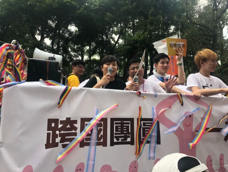 2019년 타이완 프라이드 중 TAPCPR 트럭에 오른 류민희 활동가. 당시 대만 동성결혼의 남은 과제였던 ‘외국 배우자와의 결혼에 대한 인정’이 주제였다.