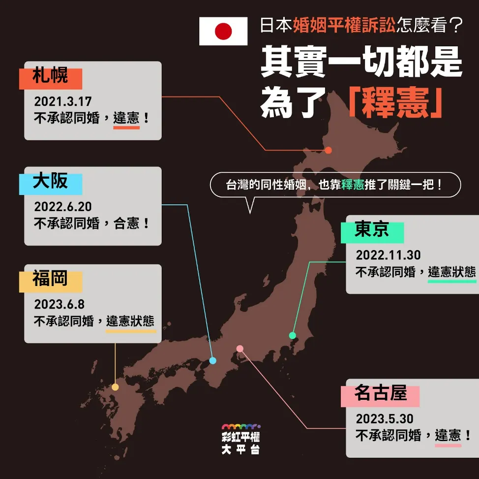 현재까지 5개 지방재판소에서 1심 판결을 선고했습니다. 이 중 4개 지방재판소는 동성혼의 불인정이 위헌 혹은 위헌 상태(일종의 ‘헌법불합치’)라는 판결을 내렸습니다(삿포로지방재판소 2021년 3월 17일, 위헌, 도쿄지방재판소 2022년 11월 30일 위헌 상태, 나고야지방재판소 2023년 5월 30일 위헌, 후쿠오카지방재판소 2023년 6월 8일 위헌상태).