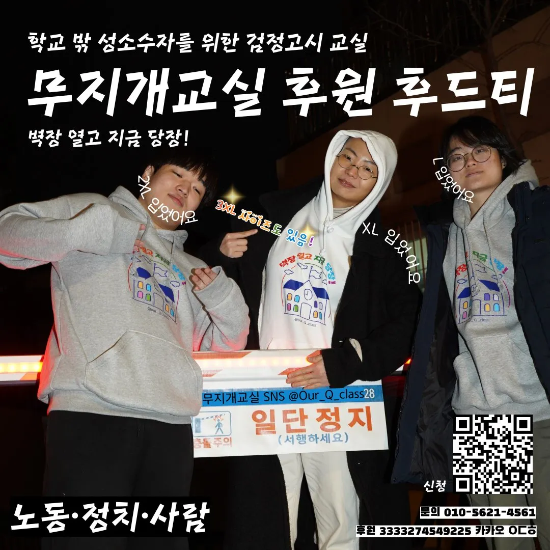 무지개교실은 학교 밖 성소수자들을 위한 수업과 모임을 열고 있어요. 기사에도 나오고요 “여기선 성정체성 신경 쓰지 않고, 모두 친구” 단편영화도 만들고 <연우의 연우> 활발한 활동하고 계시데요. 그리고 후드티도 만들어서 후원금을 모으고 계시다네요!