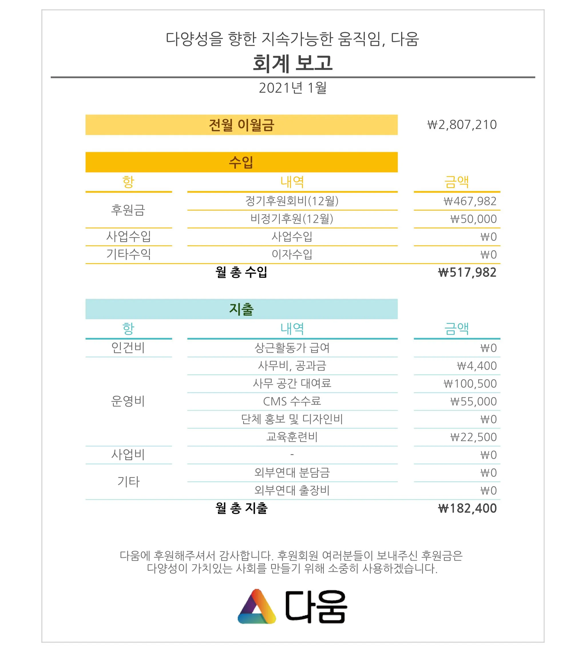 다양성을 향한 지속가능한 움직임, 다움의 회계 내역을 공개합니다.