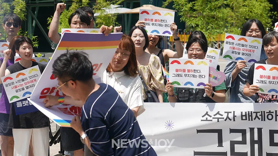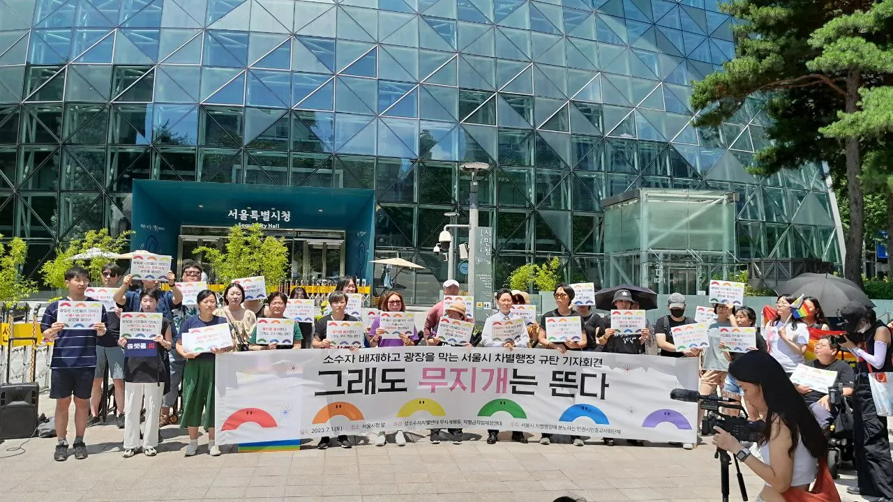 오늘 이 순간 퀴어문화축제를 못하게 했다고, 성소수자를 밀어냈다고 서울시는 안도하지 말라. 그 어떤 권력도 존엄한 이들의 존재 자체를 지울 수는 없다. 허울뿐인 약자와의 동행을 부수고 당당하게 행진하며 우리는 다시금 이 서울광장을 무지개물결로 물들일 것이다. 서울시가 내세우는 가식적 인 시혜와 동정을 거부하고 권리를 외치며 계속해서 투쟁해나갈 것이다.