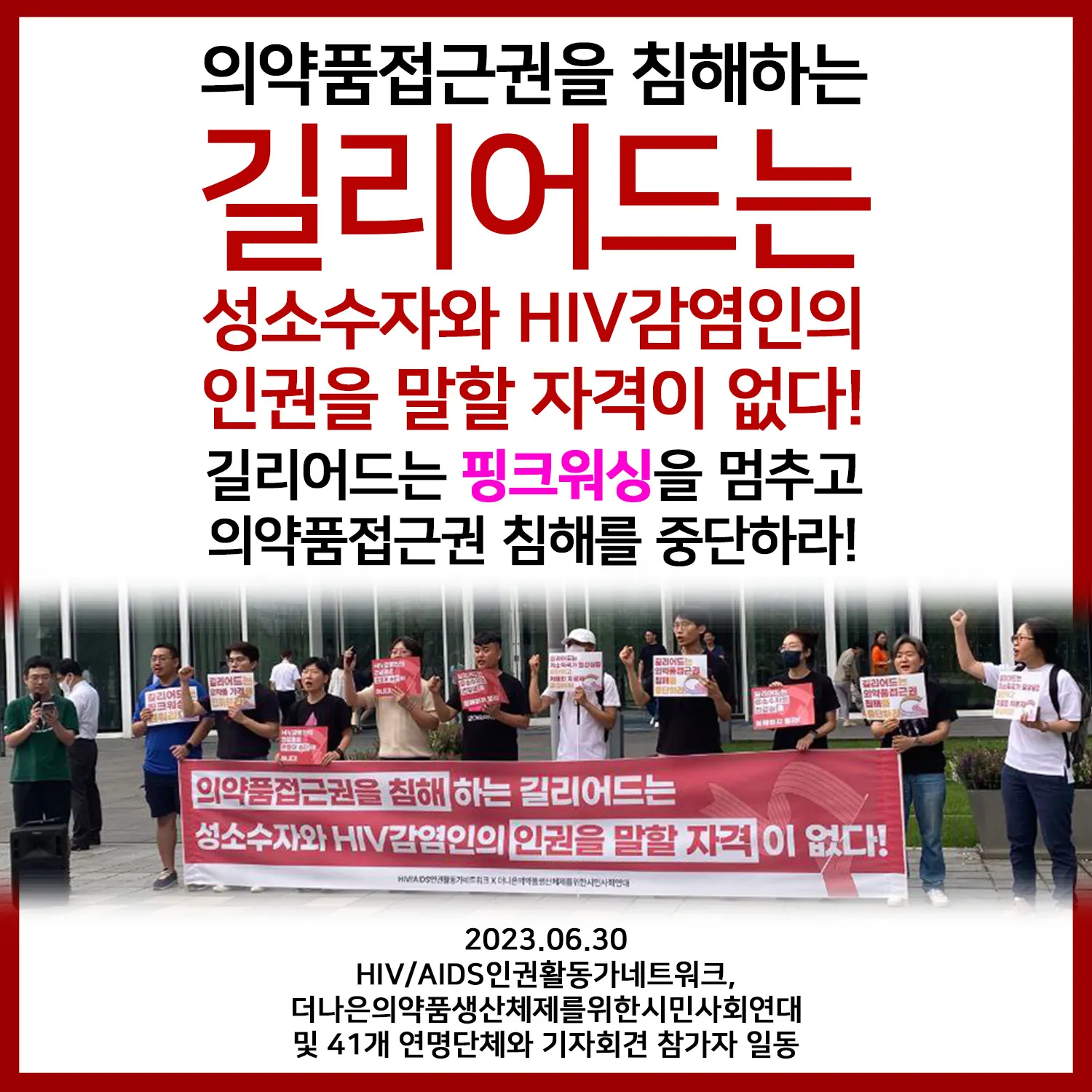 [공동성명] 의약품접근권을 침해하는 길리어드는 성소수자와 HIV감염인의 인권을 말할 자격이 없다! 길리어드는 핑크워싱을 멈추고 의약품접근권 침해를 중단하라!