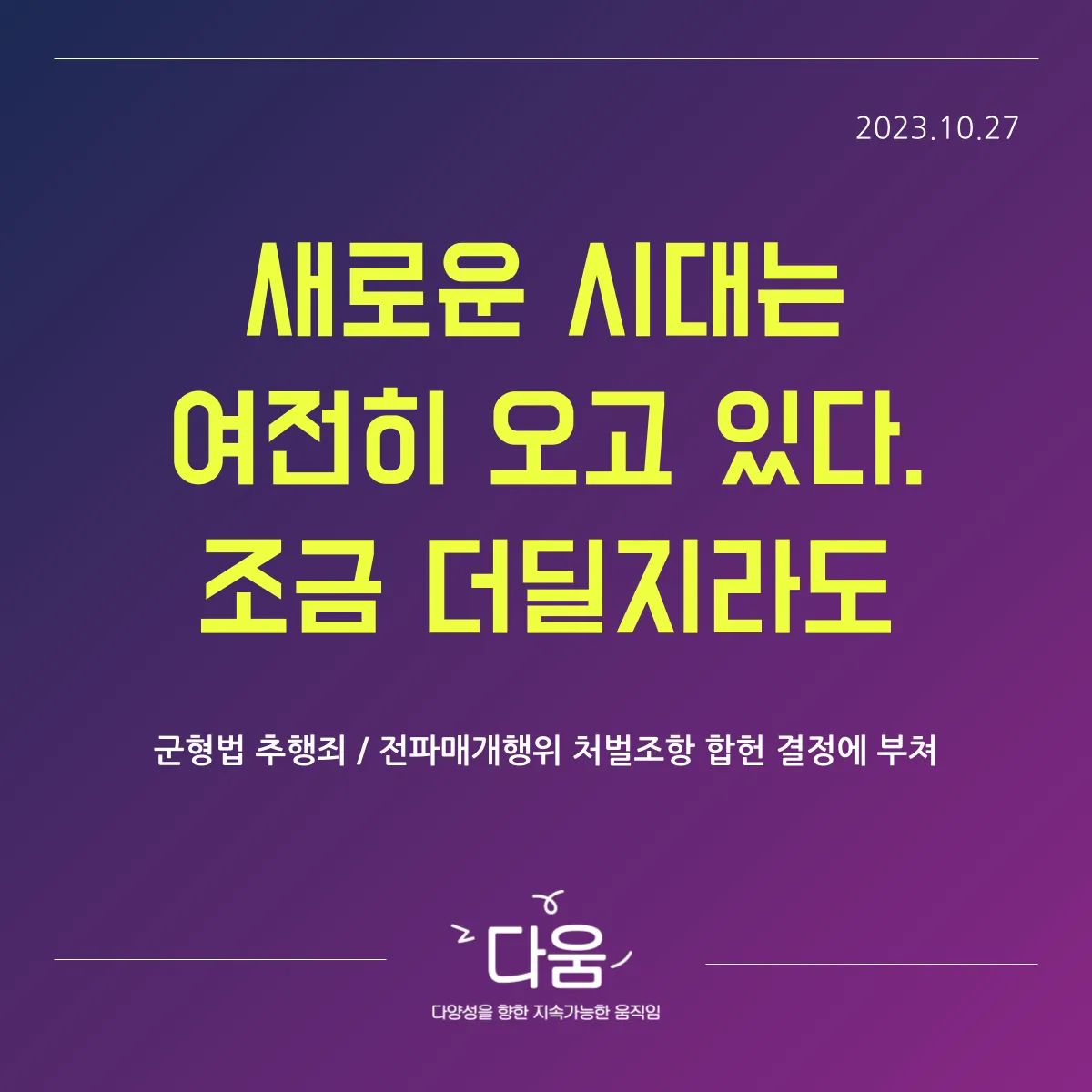 법정의견은 최신의 견해로 업데이트되지 않은 과거의 잘못된 지식, 악마화된 대상에 대한 추상적 공포로부터 기인한 편견과 혐오를 승인했지만 무언가를 지켜낸 의미있는 결정으로 남지 못할 것이다. 이 당면한 변화와 진보를 멈춰세울 수는 없기 때문이다. 거듭할수록 진전하고 있는 추행죄 반대의견이 보여주듯, 차별과 혐오가 설 자리 없는 새로운 시대는 착실히 다가오고 있다. 고통스러울만치 더디게 느껴질 수는 있겠지만 분명하게, 그리고 꾸준하게.