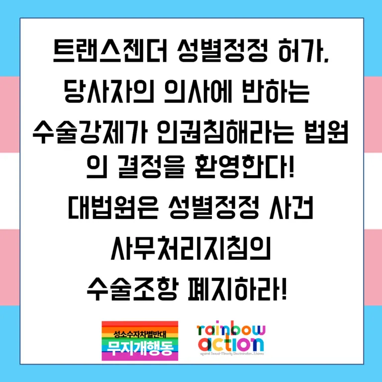 트랜스젠더 성별정정 허가, 당사자의 의사에 반하는수술강제가 인권침해라는 법원의 결정을 환영한다!대법원은 성별정정 사건 사무처리지침의 수술조항 폐지하라!