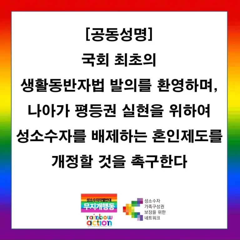 국회 최초의 생활동반자법 발의를 환영하며,나아가 평등권 실현을 위하여 성소수자를 배제하는 혼인제도를 개정할 것을 촉구한다