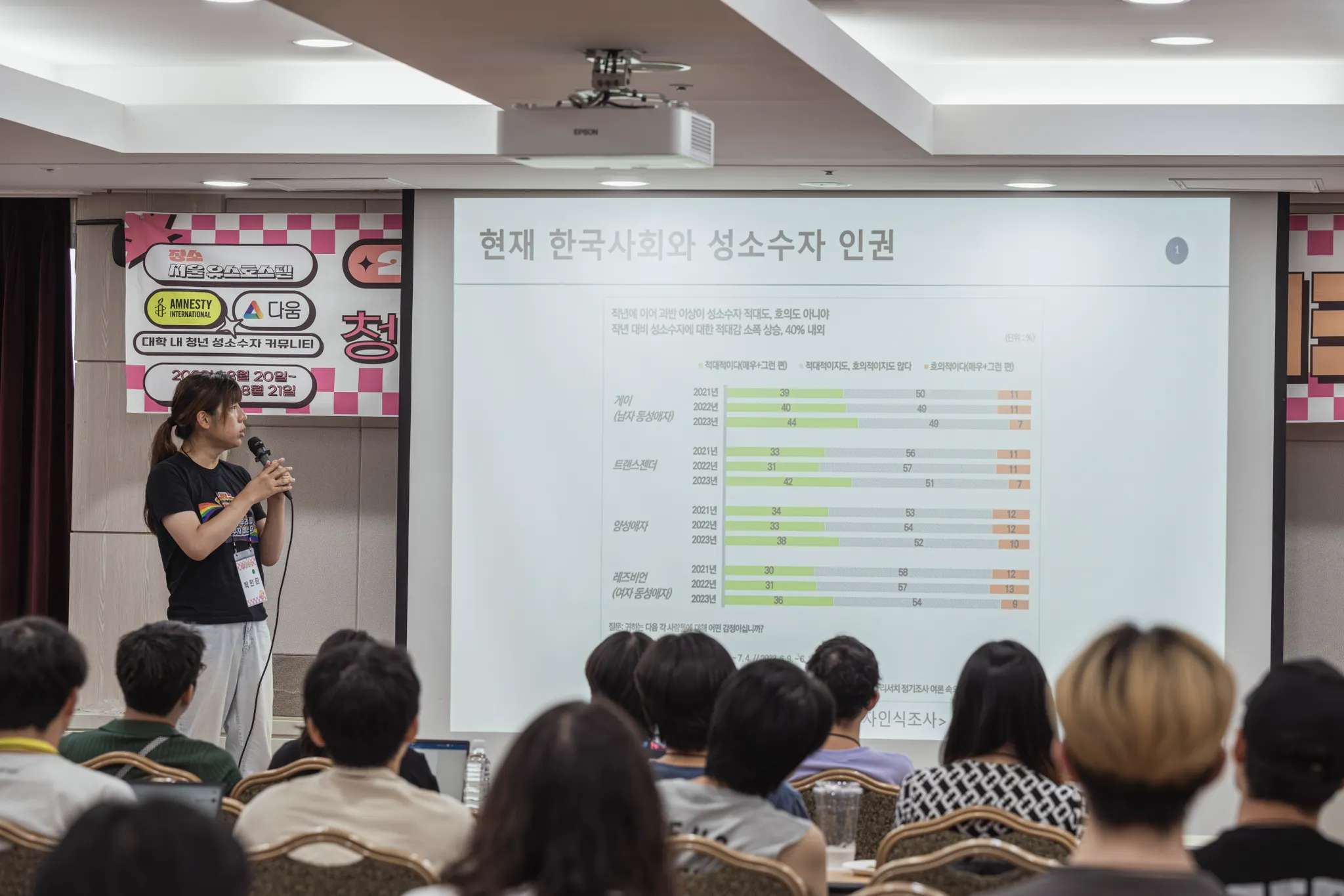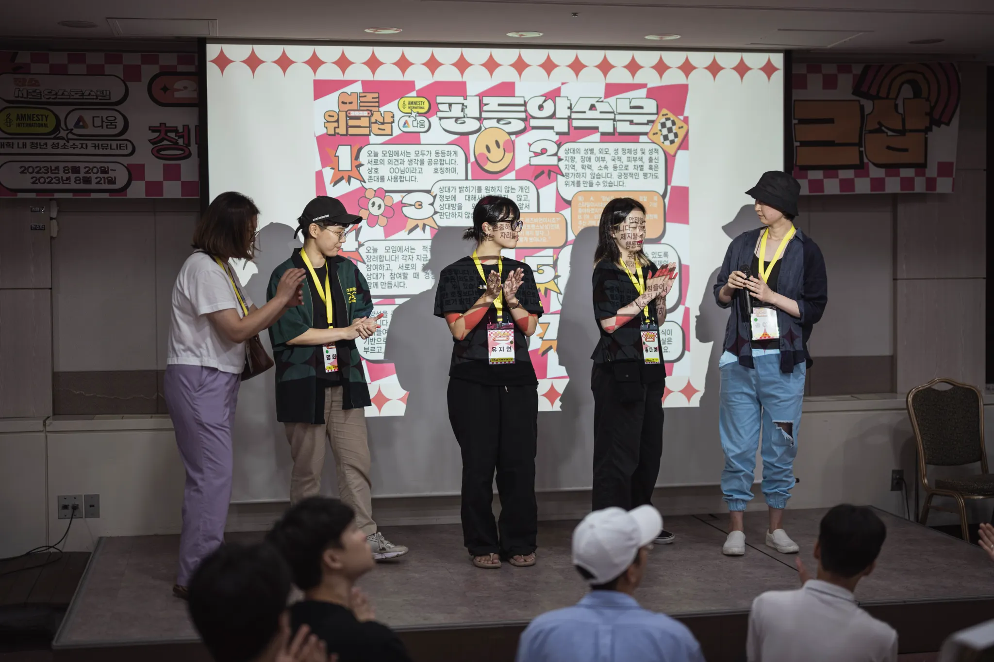 2023 청년 성소수자 여름 워크샵은 다양성을향한지속가능한움직임 다움, 국제앰네스티, 19개 대학의 성소수자 모임이 함께 개최한 행사입니다. 코로나19 팬데믹 이후 사회적 거리두기로 인해 많은 대학 성소수자 모임이 운영 동력을 잃고 위축되거나 해산하기도 했습니다. 대학·청년성소수자모임연대 QUV 또한 이 과정에서 해산을 결정했지요. 사회적 거리두기가 완화된 2022년 여름부터 대학 성소수자 모임이 두 차례 연합엠티를 다녀오면서 대학 성소수자 모임 간의 교류가 다시금 활성화 되고, 여러 모임의 활동도 되살아나기 시작했습니다. 다움과 앰네스티는 이러한 흐름을 북돋고 지원하기 위해 지난 2023년 2월부터 대학 성소수자 모임을 대상으로 커뮤니티 빌딩 사업을 진행해왔습니다. 이번 여름 워크샵은 대학 성소수자 커뮤니티 빌딩 사업의 일환으로 개최되었습니다. 워크샵에는 약 110명 가량의 대학생들이 참여하였습니다.