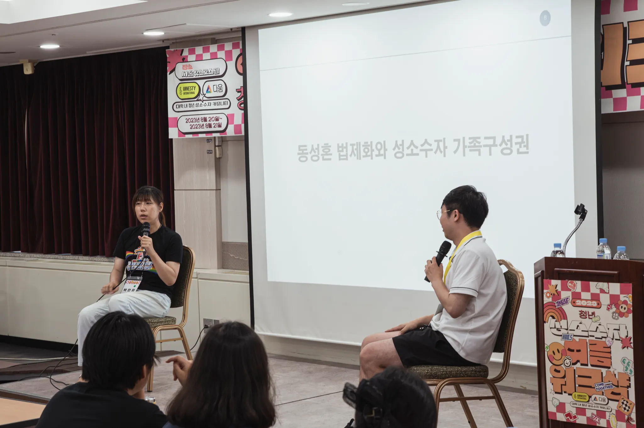 첫 번째 세션인 <동성배우자와 함께 살아가는 사람들>은 여러 참여자에게 깊은 인상을 남겼습니다. 킴님이 유튜버를 하면서 자신이 게이이며 동성파트너와 함께 살아가고 있다는 사실이 직장 동료에게 알려진 이야기부터 장서연님과 화영님이 양가에 파트너 관계를 밝히면서 가족과 겪게 되었던 웃픈 에피소드. 그리고 현행 혼인 제도가 동성배우자를 인정하지 않는 차별을 폐지하고, 혼인이 아니더라 실질적으로 생계를 같이 하고 있는 이들을 위한 제도를 만들자는 이야기까지 다들 한바탕 울고 웃는 시간이었습니다. 특히 화영님이 자신이 20대일 때는 성소수자에 대한 정보도 부족한 상황에서 스스로를 부정하는 시간을 거쳐야 했는데 같이 자신을 지지해주는 기반조차 없어 너무 힘들었다며, 오늘과 같은 기회를 통해 좀 더 용기 내고 행복한 삶을 상상할 수 있었으면 좋겠다는 덕담을 나눠주기도 했습니다.