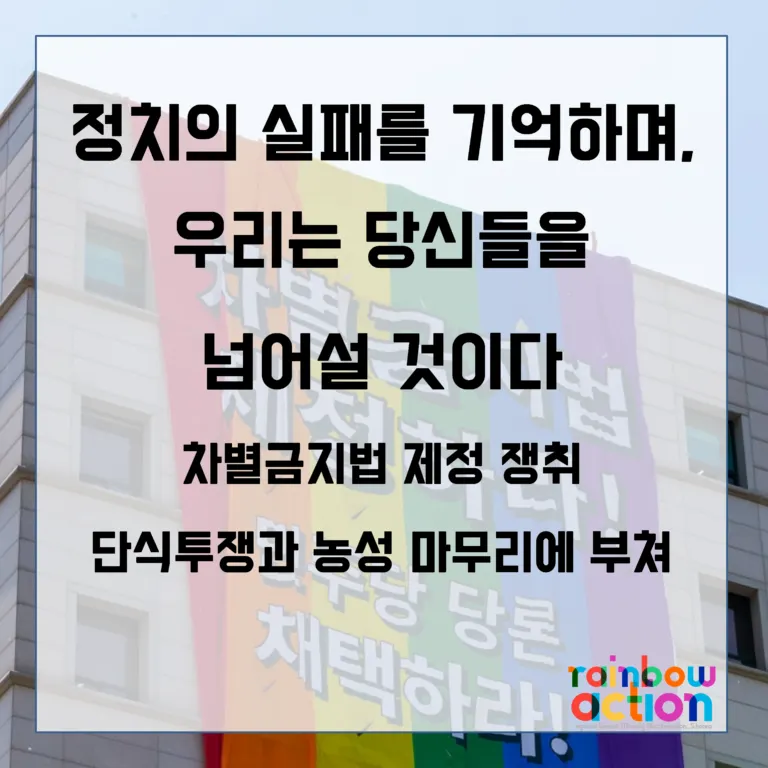 그렇게 무능하고 무책임한 정치의 실패로 여전히 우리 앞에는 차별의 현실이 놓여져 있다. 그러나 우리는, 성소수자 운동은 이러한 현실에 지치고 슬퍼할 수는 있을지언정 절망하지는 않는다. 우리의 삶이 계속 이어지듯이, 단식투쟁과 농성은 마무리 되지만 평등을 위한 투쟁은 결코 멈추지 않을 것이기 때문이다. 모든 이들의 평등을 외치는 자리에 파고드는 성소수자 혐오선동에 서로를 위로하며 함께 맞섰던 것처럼, 우리는 연대와 용기로, 정치가 해야했을 책임을 완수해나갈 것이기 때문이다. 오늘 이 날의 정치의 실패를 분명히 기억하며, 우리는 당신들을 넘어설 것이다.