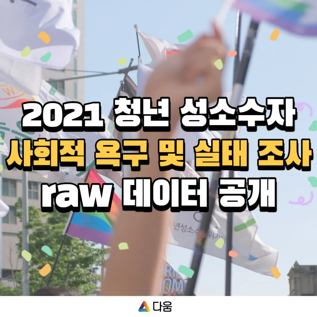 다양성을 향한 지속가능한 움직임, 다움은 한국 사회 내 다양성 확산과 성소수자 인권 개선에 활용하기 위한 목적으로 <2021 청년 성소수자 사회적 욕구 및 실태 조사>를 수행하여 보고서를 발간하였습니다. 본 조사의 원자료(raw data)를 활용하여 추가적인 분석과 연구를 수행하고자 하는 분들께서는 아래 양식을 작성해주시기 바랍니다. 더불어 자료의 전반적인 개요는 아래 첨부한 보고서와 문항지를 참고해주세요.