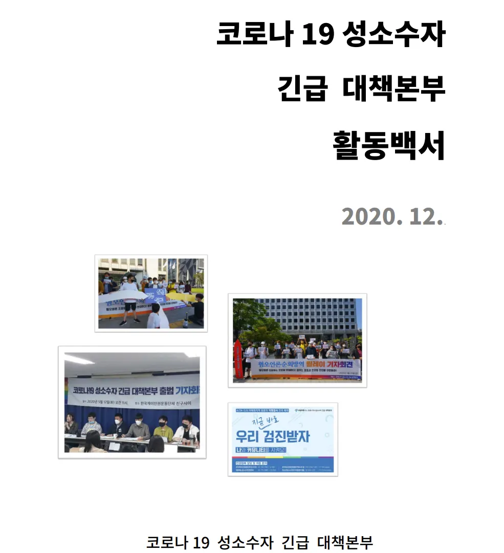 2020년 5월 이태원 코로나19 집단감염 상황에서 성소수자 혐오에 대응하여 질병을 극복하기 위하여 결성된 ‘코로나19 성소수자 긴급 대책본부’에 합류하여 6월까지 활동하였습니다. 2020년 12월 발간된 대책본부 백서를 공유합니다.