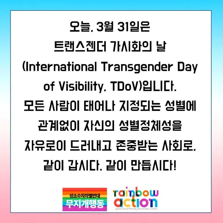 오늘, 3월 31일은 트랜스젠더 가시화의 날(International Transgender Day of Visibility, TDoV)입니다. 트랜스젠더는 우리 사회를 함께 구성하고 살아가는 존엄한 사람들로서, 때로는 평범하게 때로는 특별하게 우리의 일상을 같이 일구어냅니다.